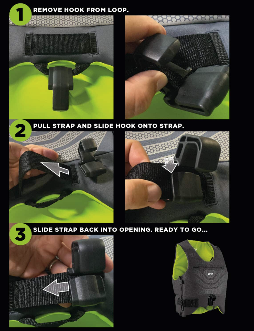DO NOT use it to attach your wing leash, this is not made for this purpose ⚠️ You will find the plastic hook of your vest hooked on this loop for transportation reason only. Please install the Hook on the Webbing strap as per explained in the video bellow